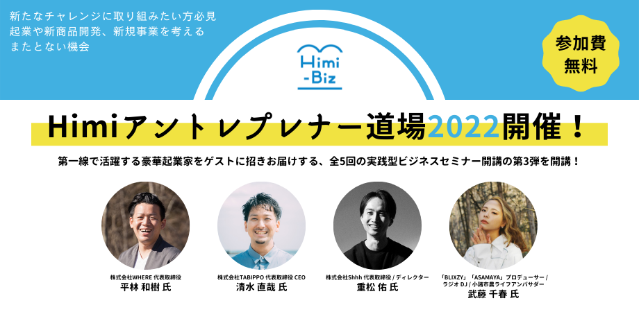 起業や新規事業創出を考えている人たちが自分のやりたいことを言語化したり、プラン化したりする機会提供として、氷見市ビジネスサポートセンター(以下、Himi-Biz)がビジネスセミナー「Himiアントレプレナー道場」を開講しており、2021年・2022年に渡って、ビジネスセミナーの企画・運営および、講師陣のアサイン等を担当した。